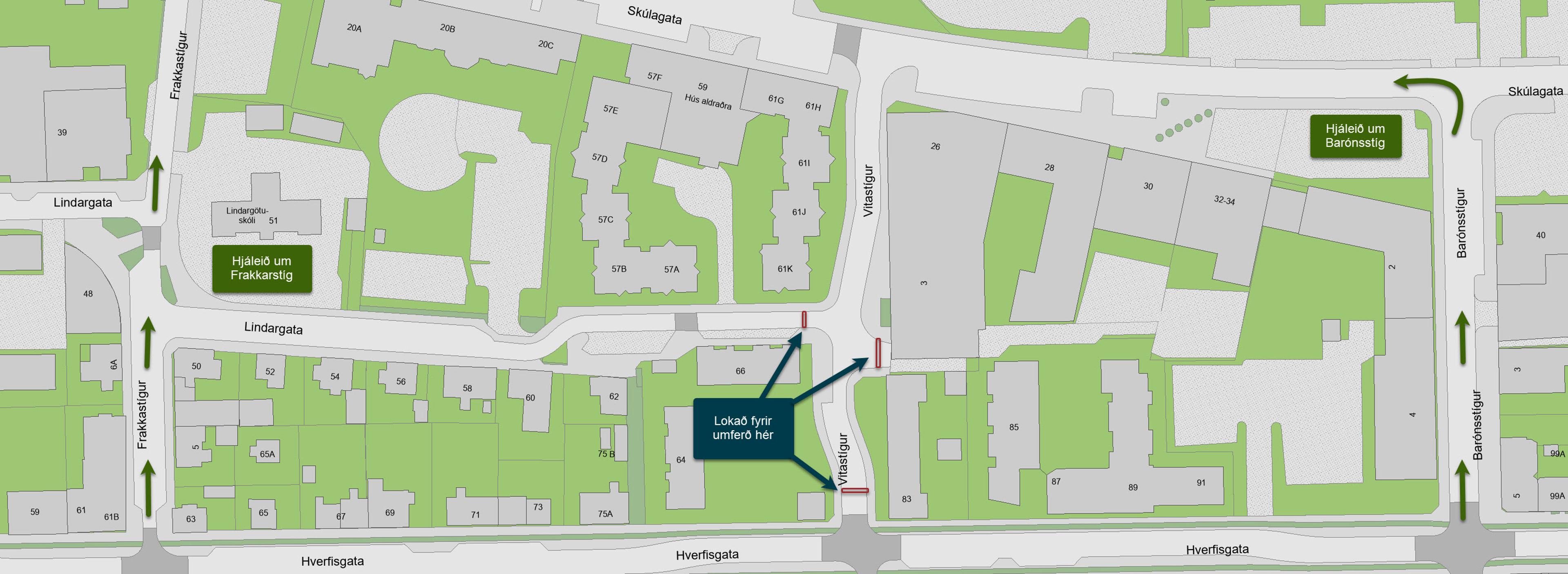 Af þeim sökum verður lokað fyrir umferð við Vitastíg. Hjáleiðir fyrir gangandi og hjólandi vegfarendur verða settar upp og sérstök áhersla lögð á öryggi vegfarenda og starfsfólks meðan á framkvæmdum stendur.